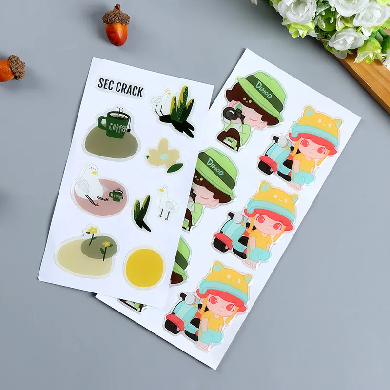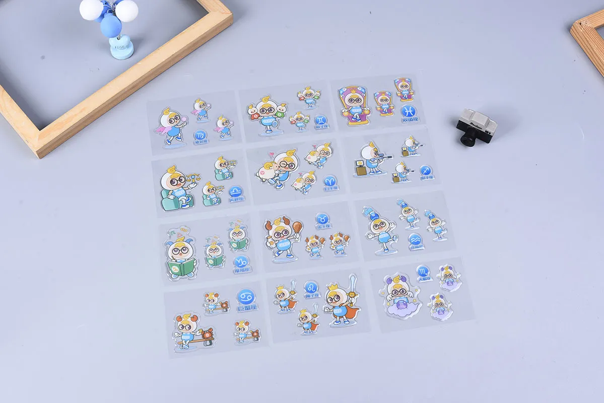 Rajzfilm epoxi gyanta matricák! A megjelenés egyedi. Miután az epoxi gyanta gyógyul, ugyanolyan kristálytiszta, mint a kristály. A matricák erős háromdimenziós hatása van, azonnal javítva az osztályt. Sőt, lézerhatássá is el lehet készíteni. A lézer káprázatos fénye és a kristálygylans textúrája rendkívül lenyűgöző vizuális hatást eredményez. Akár termékek promóciójára, akár dekorációra használják, mindenki figyelmét rögzítheti.