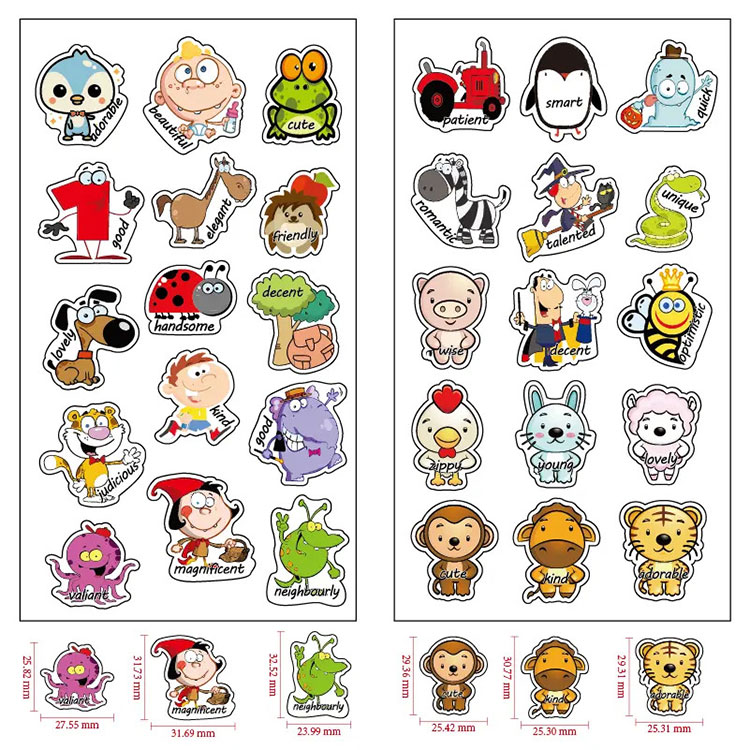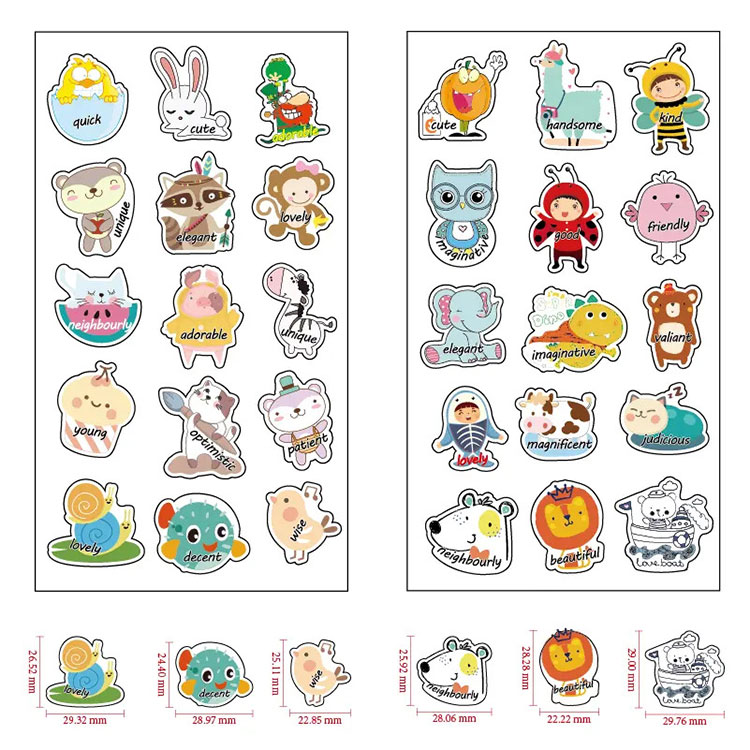 Kiváló minőségű rajzfilmes jutalommatricák a kínai JOJO Pack gyártótól. rajzfilm jutalom matricák jelvény téma tervez. perforált kialakítás, könnyen letéphető, nem hagy nyomot, ezek a matricák használhatók szabadtéri sportokhoz és tantermi témájú bulikhoz. Végtelen szórakozást nyújtanak gyerekeknek és felnőtteknek. Szabadtéri sportjátékok nyereményeként is felhasználhatod őket.