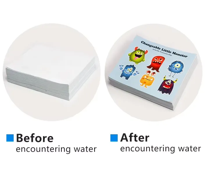 A színváltó vízre érzékeny címkéket 3 másodpercre vízbe merítve teljesen megduzzadnak és szétoszlanak, a színváltozás hatása pedig nagyon nyilvánvaló.