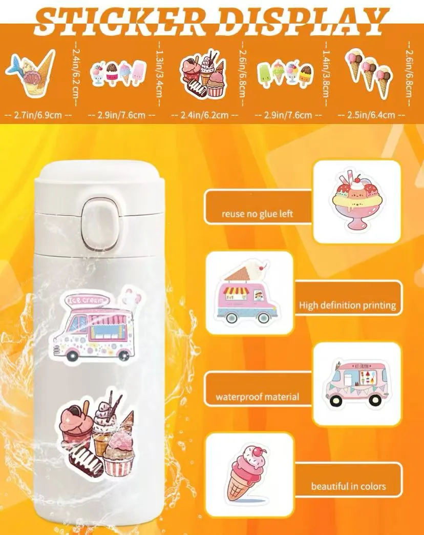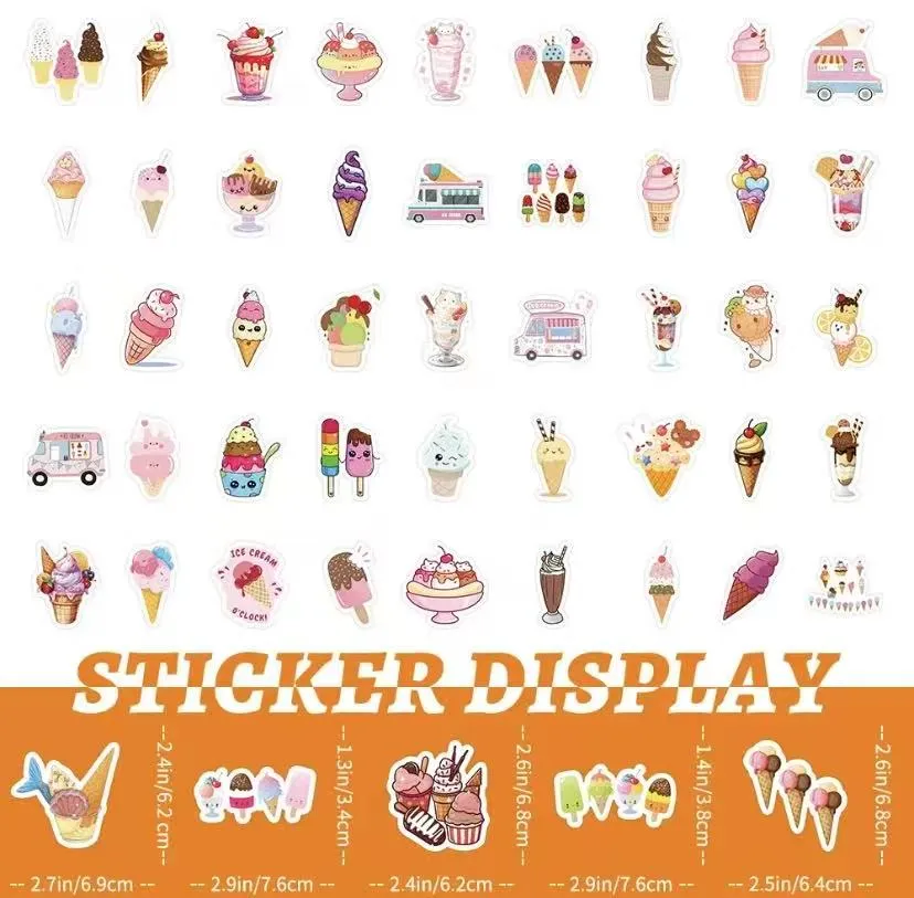 Ez a termék 50 függetlenül tervezett fagylaltmatricát tartalmaz, ismétlődő minták nélkül, kielégítve a különféle dekorációs igényeket. A matricák környezetbarát PVC anyagból készülnek, és a vízállóság és a kopásállóság miatt kezelték őket, így különféle forgatókönyvekhez és hosszú ideig tartósok. A hátlap ragasztója kiváló minőségű, eltávolítható ragasztóból áll, amely határozottan betartja és nem hagy jeleket, amikor eltávolítják, és a mintákat nagyszabású kikapcsolási technológiával nyomtatják, gazdag és élénk színekkel, tiszta részletekkel, és az idő múlásával nem könnyen elhalványul.