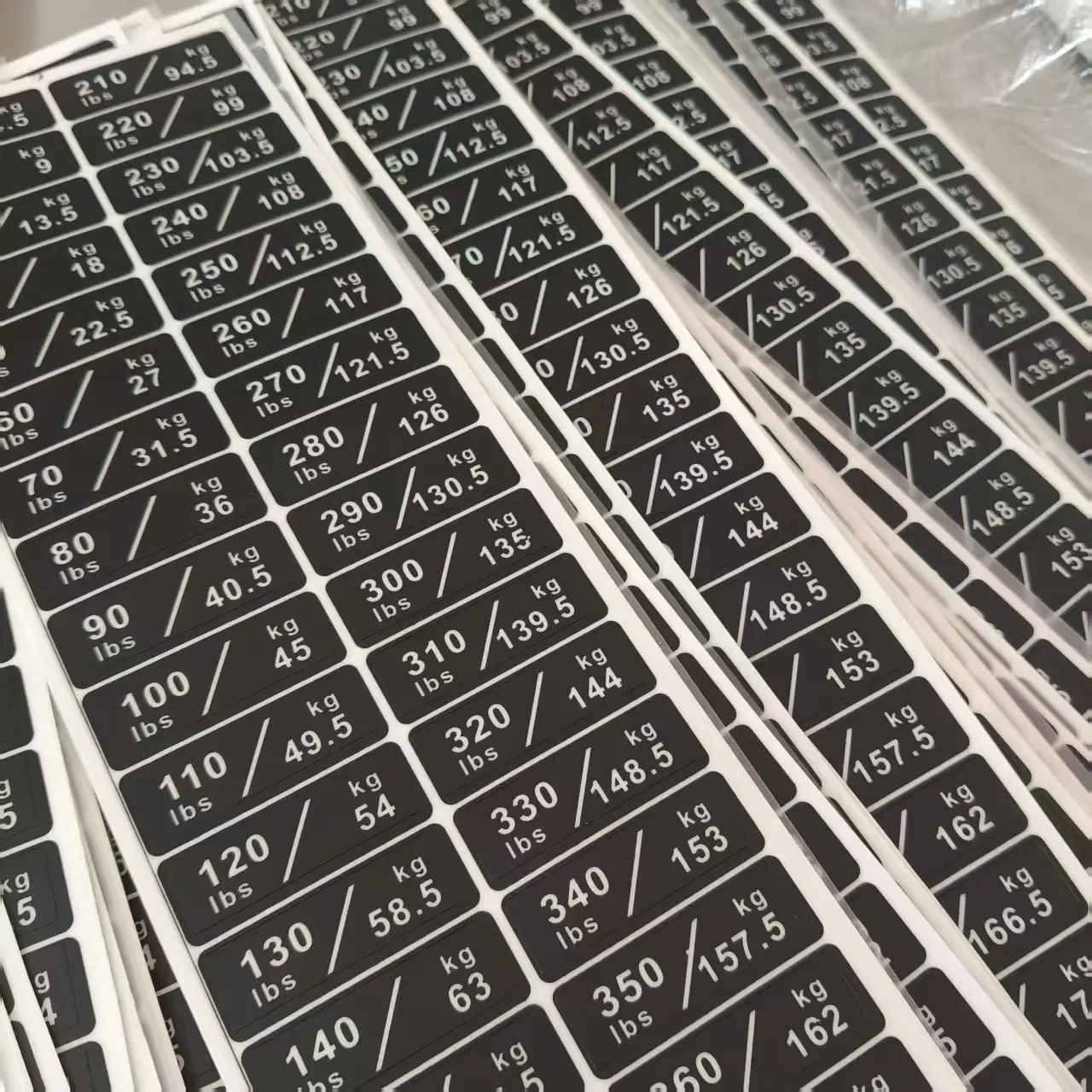 A fitneszeszközök súlytábláinak matricái speciális öntapadó címkék, amelyeket az erősítőgépek súlytábláihoz terveztek. Alapvető funkciójuk a súlyértékek, például 5 kg és 10 kg egyértelmű megjelölése, segítve a felhasználókat a súlyok gyors azonosításában és az edzési ellenállás pontos beállításában. Széles körben használják mind a kereskedelmi edzőtermekben, mind az otthoni erősítő berendezésekben.
