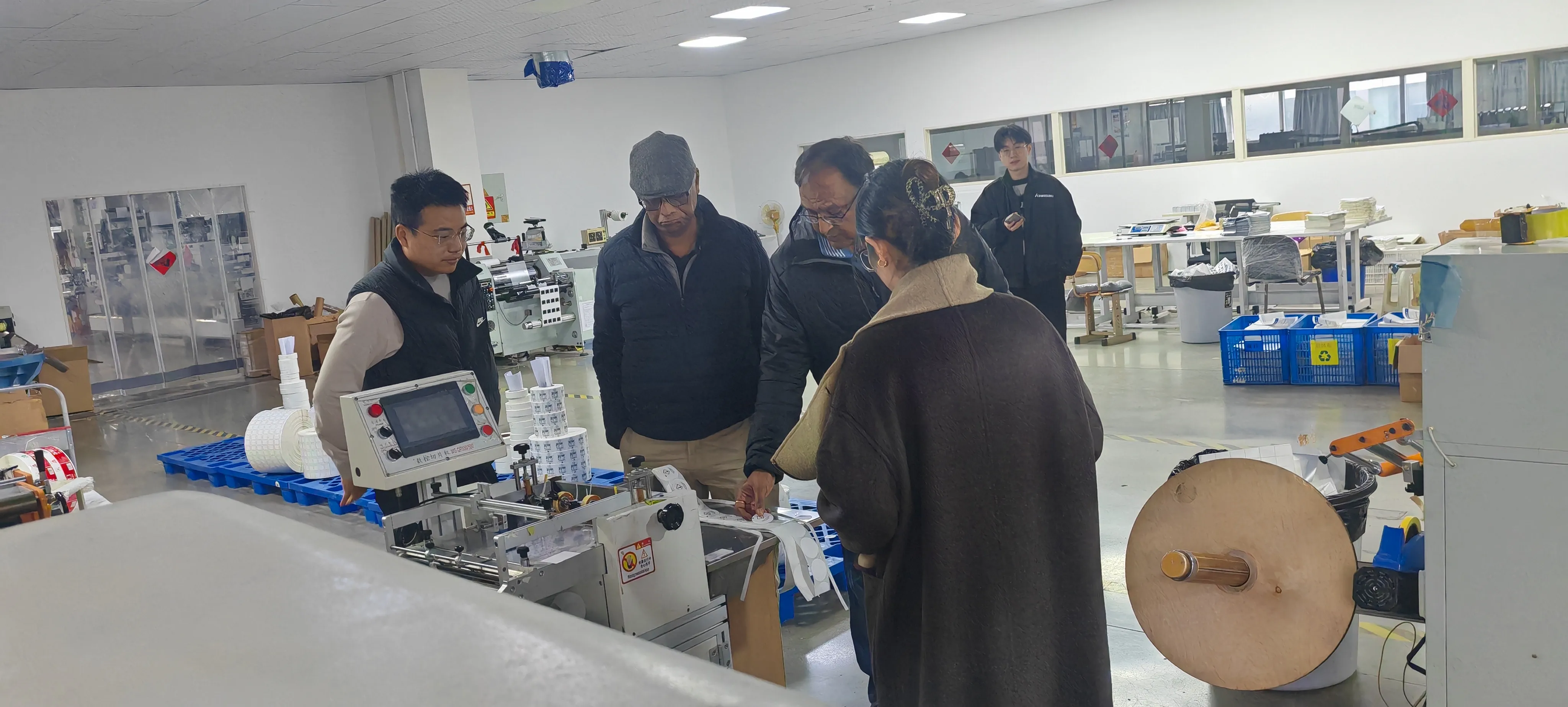 A látogatás során a cég vezetőinek és illetékes osztályvezetőinek kíséretében az indiai ügyfélcsoport sorra behatolt cégünk fő területeibe, így a gyártóműhelybe, a minőségellenőrző központba és a nyersanyagraktárba, hogy megfigyelje a csomagolási címkék teljes folyamatát a nyersanyag kiválasztásától a precíziós nyomtatáson, a préselésen át a késztermék-ellenőrzésig.